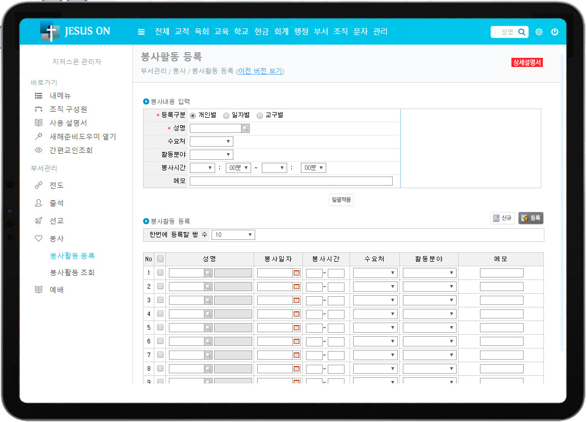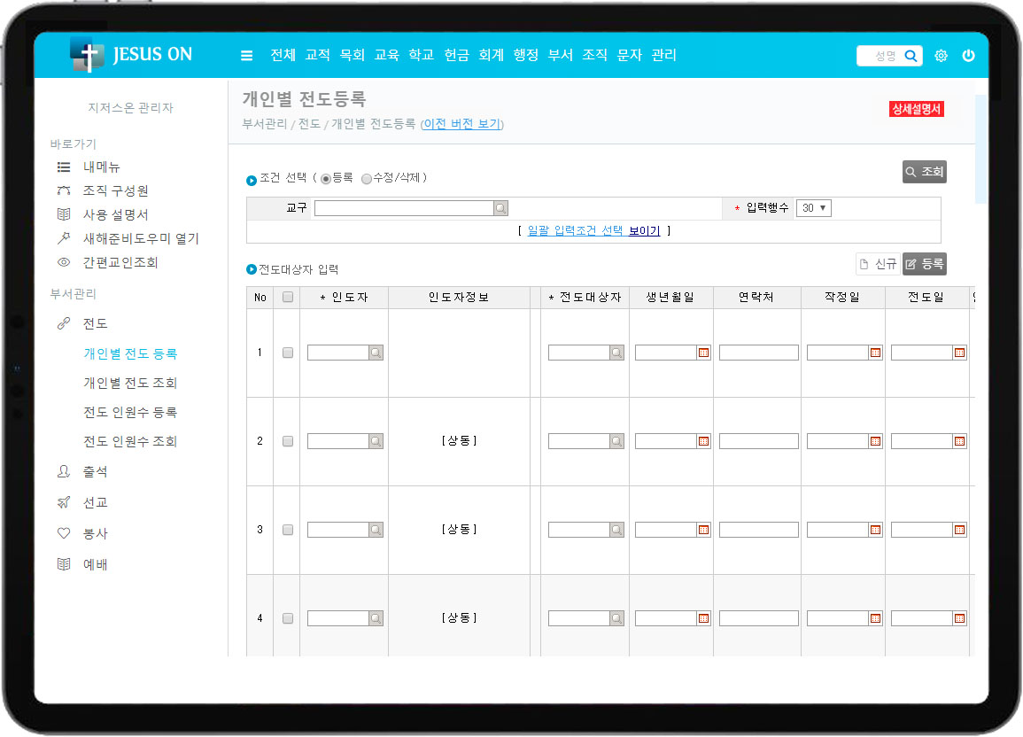 • 개인별, 일자별, 교구별로 일괄 등록