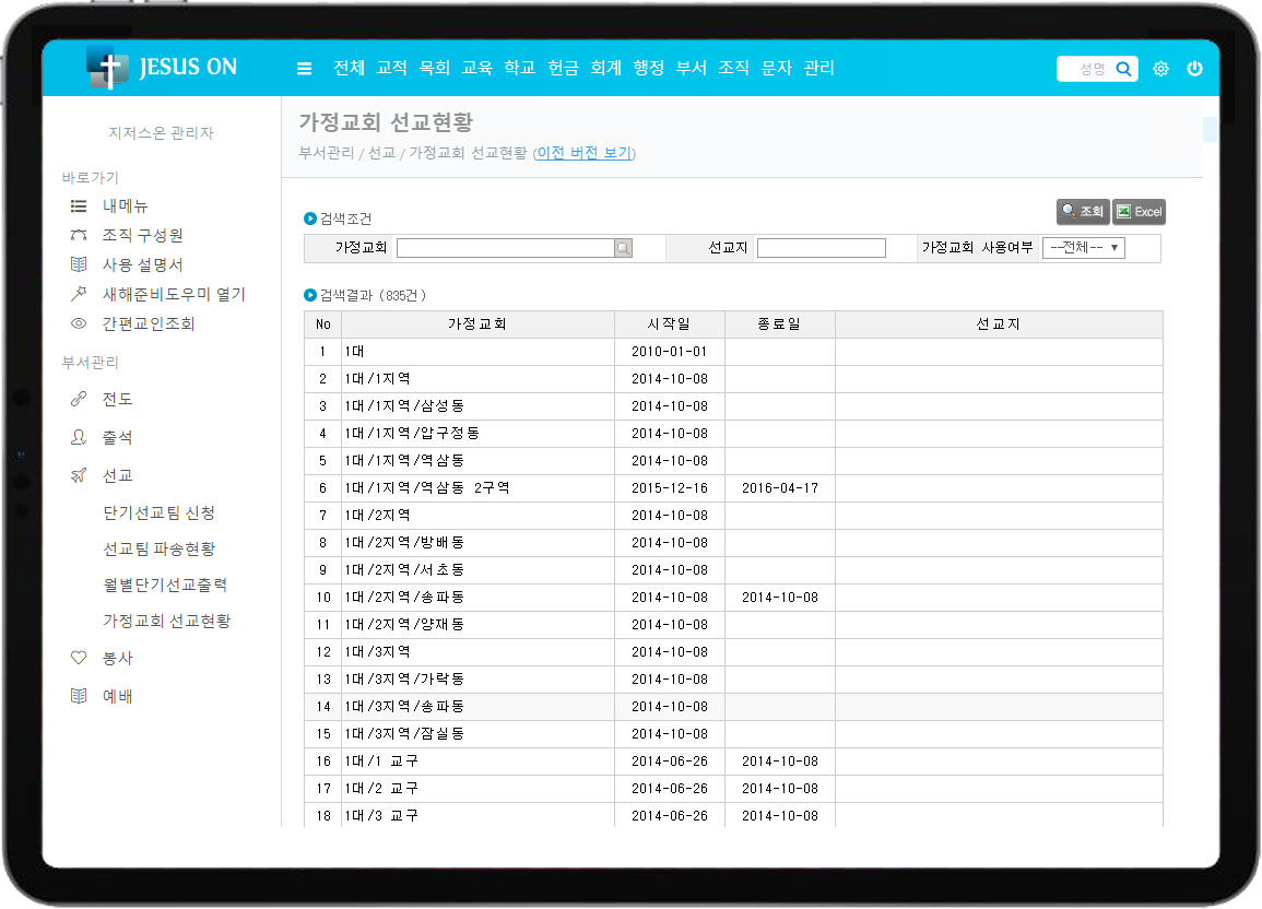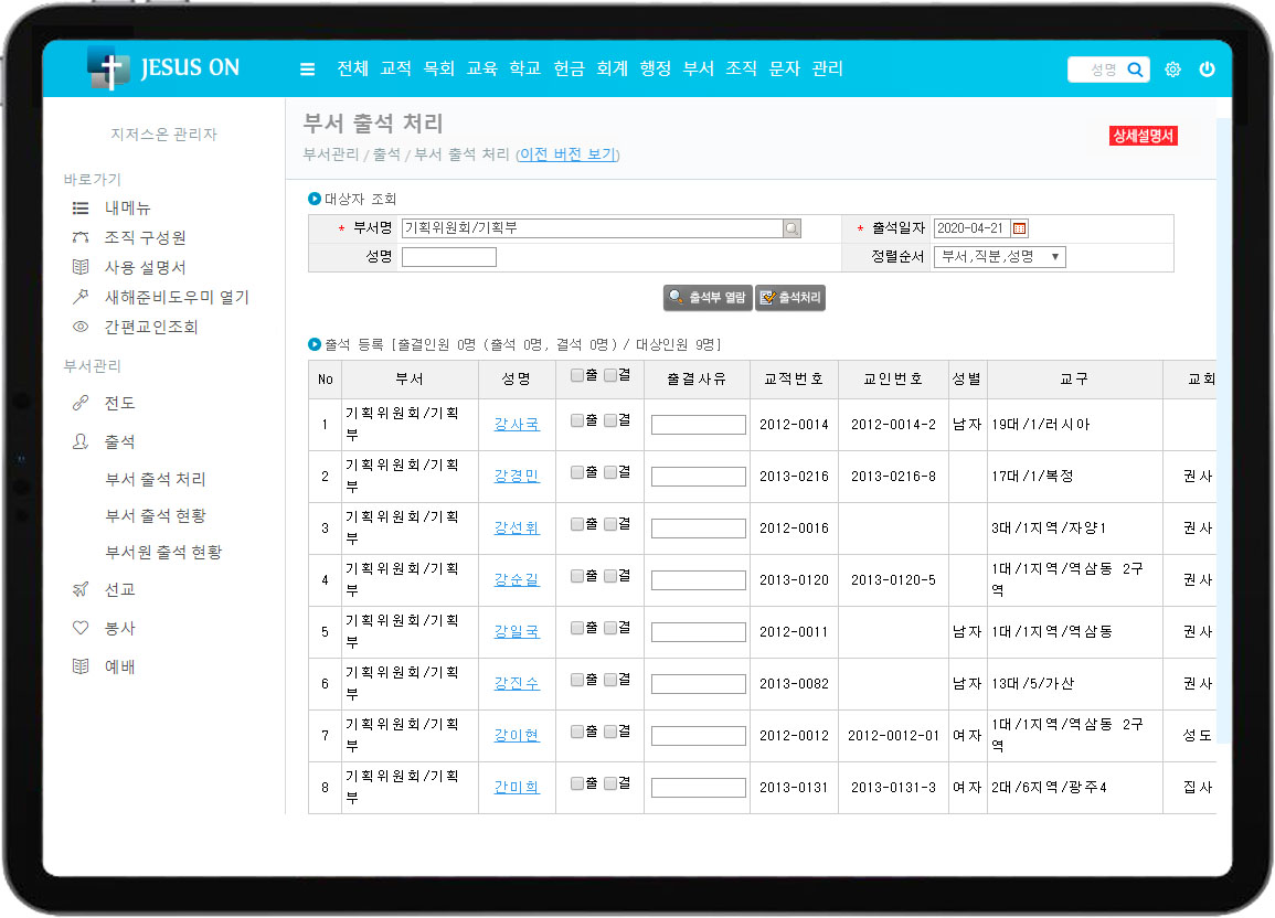 교회행정관리의 부서관리 화면을 소개합니다.