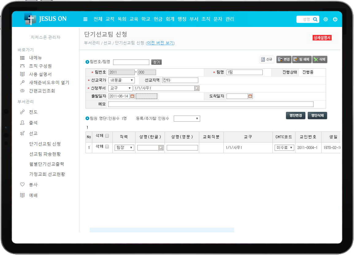 • 단기선교팀 등록, 변경, 삭제, 팀 해체