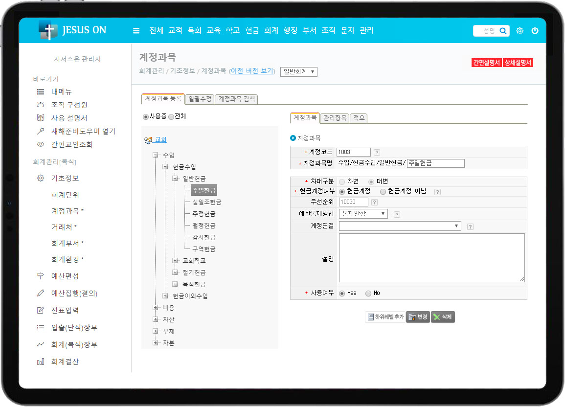 트리형태로 보면서 예산과목을 등록, 변경, 삭제