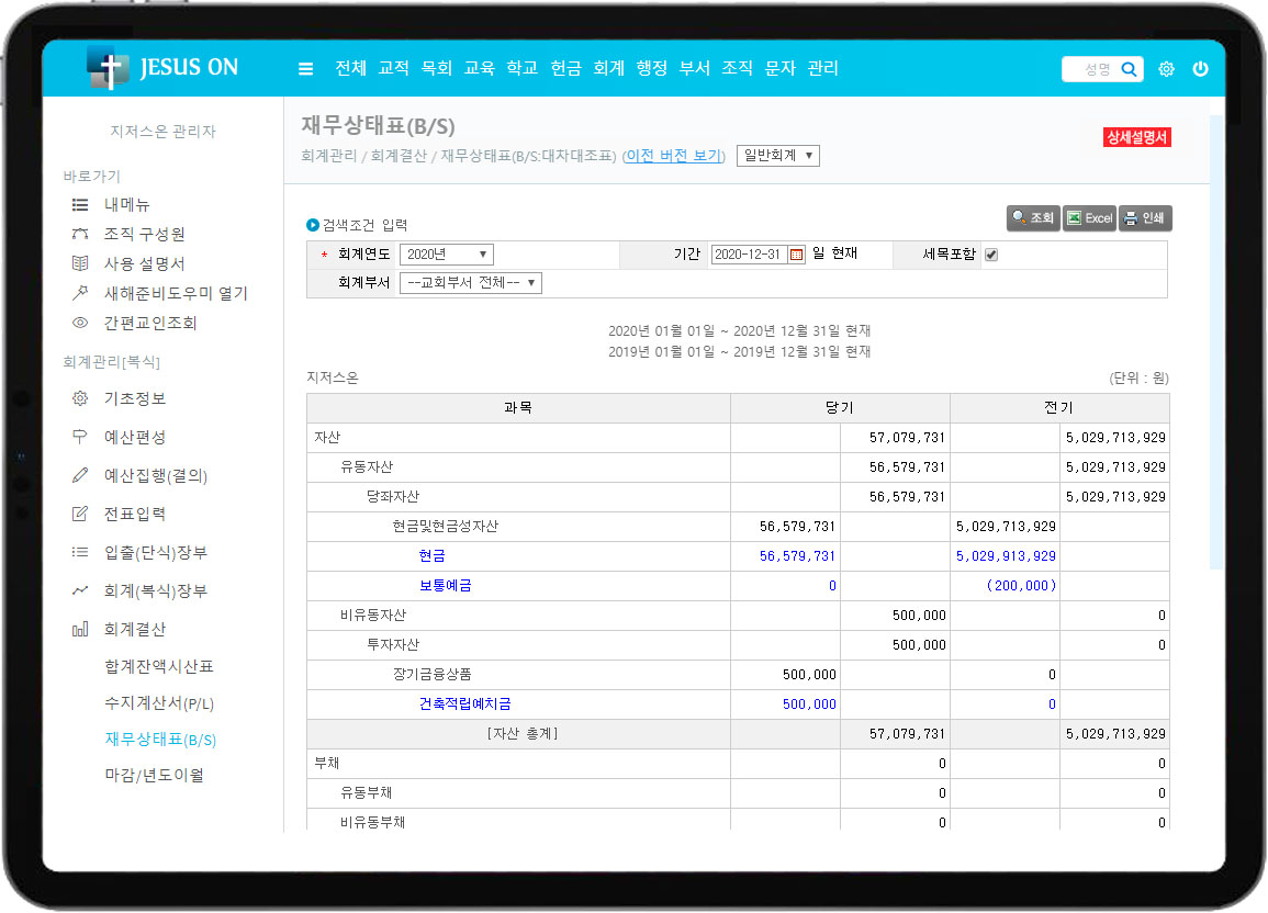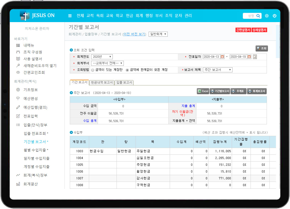 헌금내역 보고서 - 조회, 엑셀, 출력
