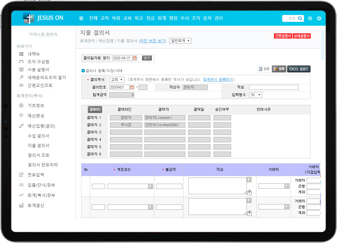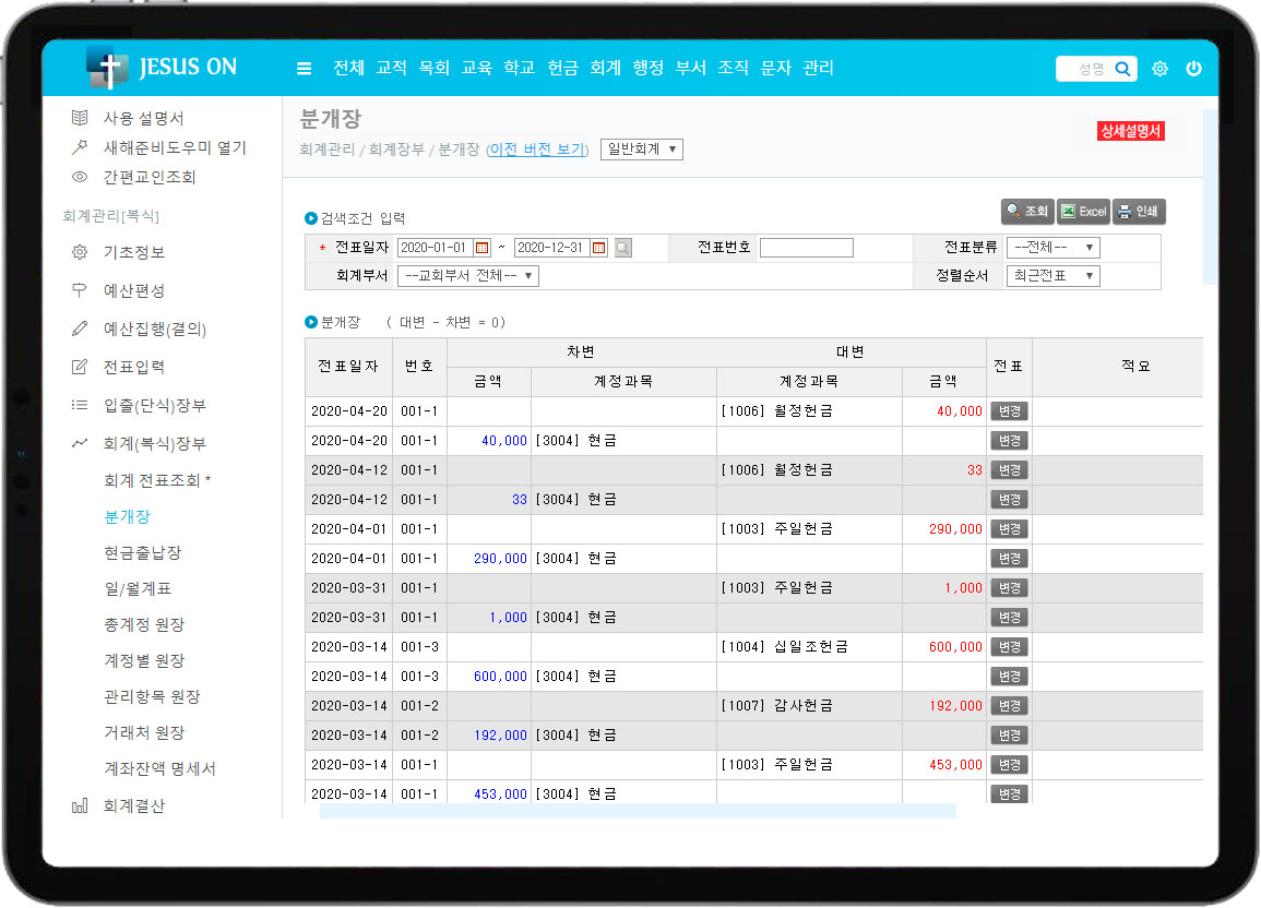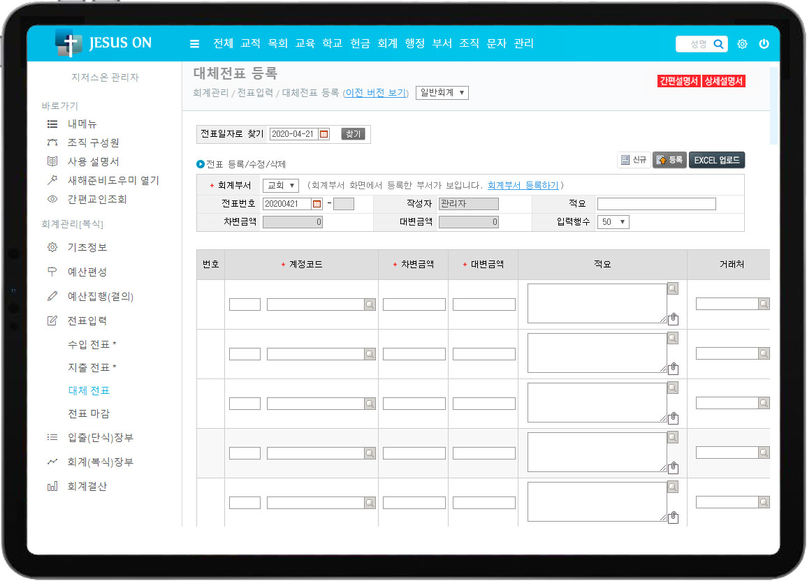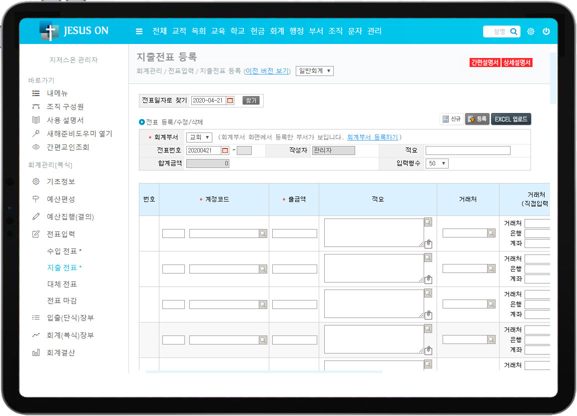 복식회계나 분개, 상대계정에 대한 지식이 없는 교회의 경우 수입, 지출 전표만 입력하여 쉽게 사용할 수 있습니다.