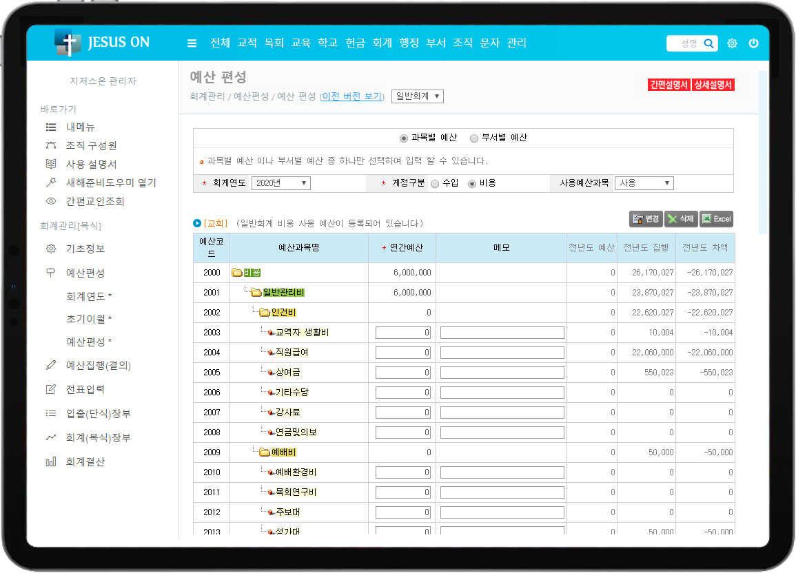 과목별, 부서별 연간 예산 등록, 변경, 삭제