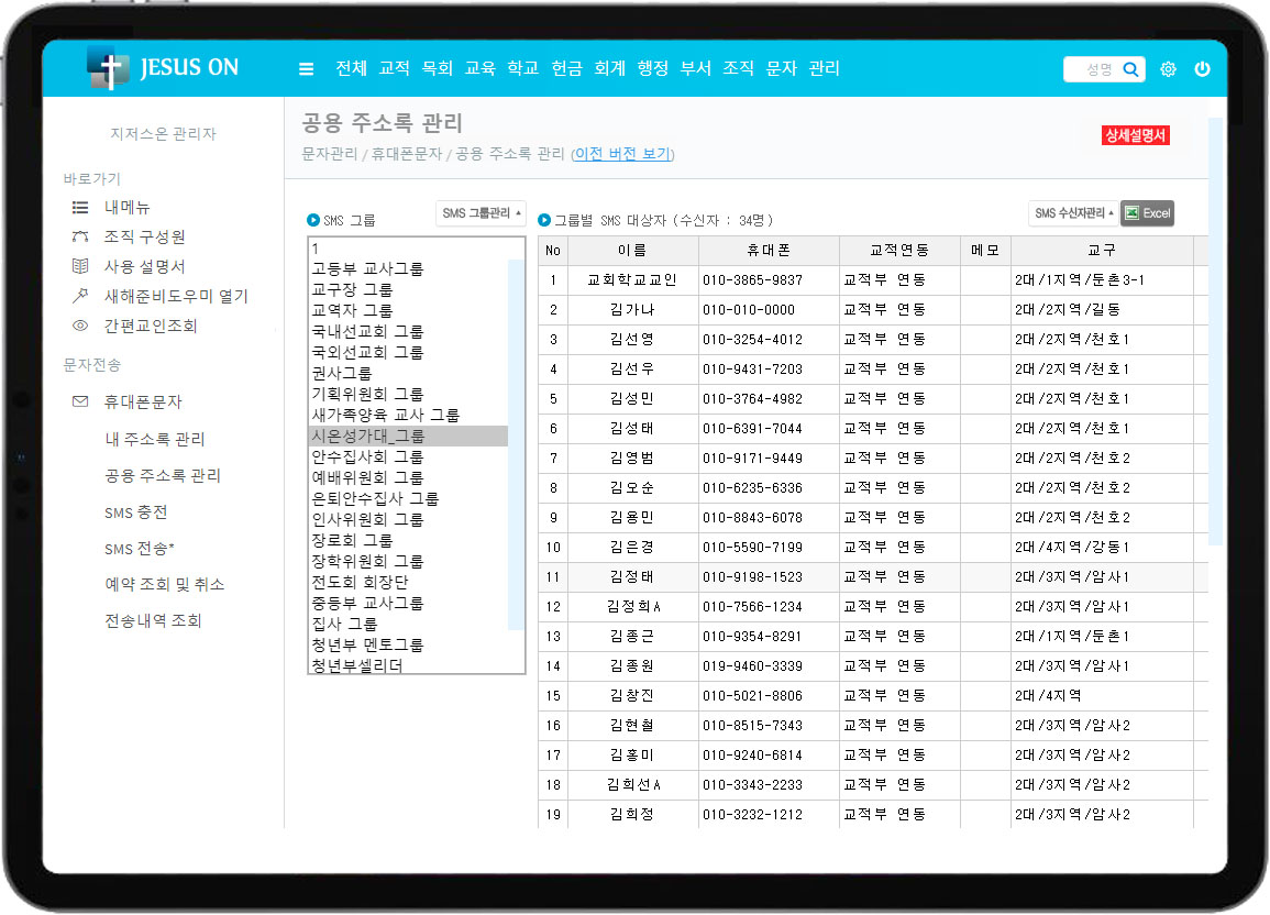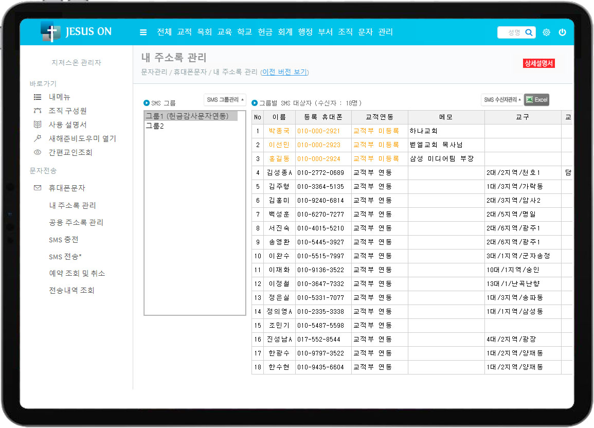 • 교적에 등록한 경우에는 주소록을 만들지 않아도 문자 발송시 교적부의 전화번호를 실시간 검색해서 보내면 됩니다.
