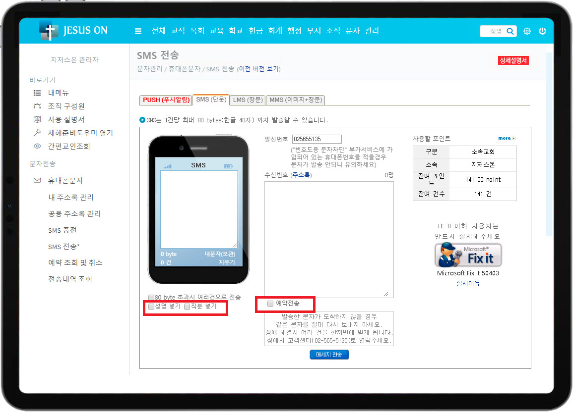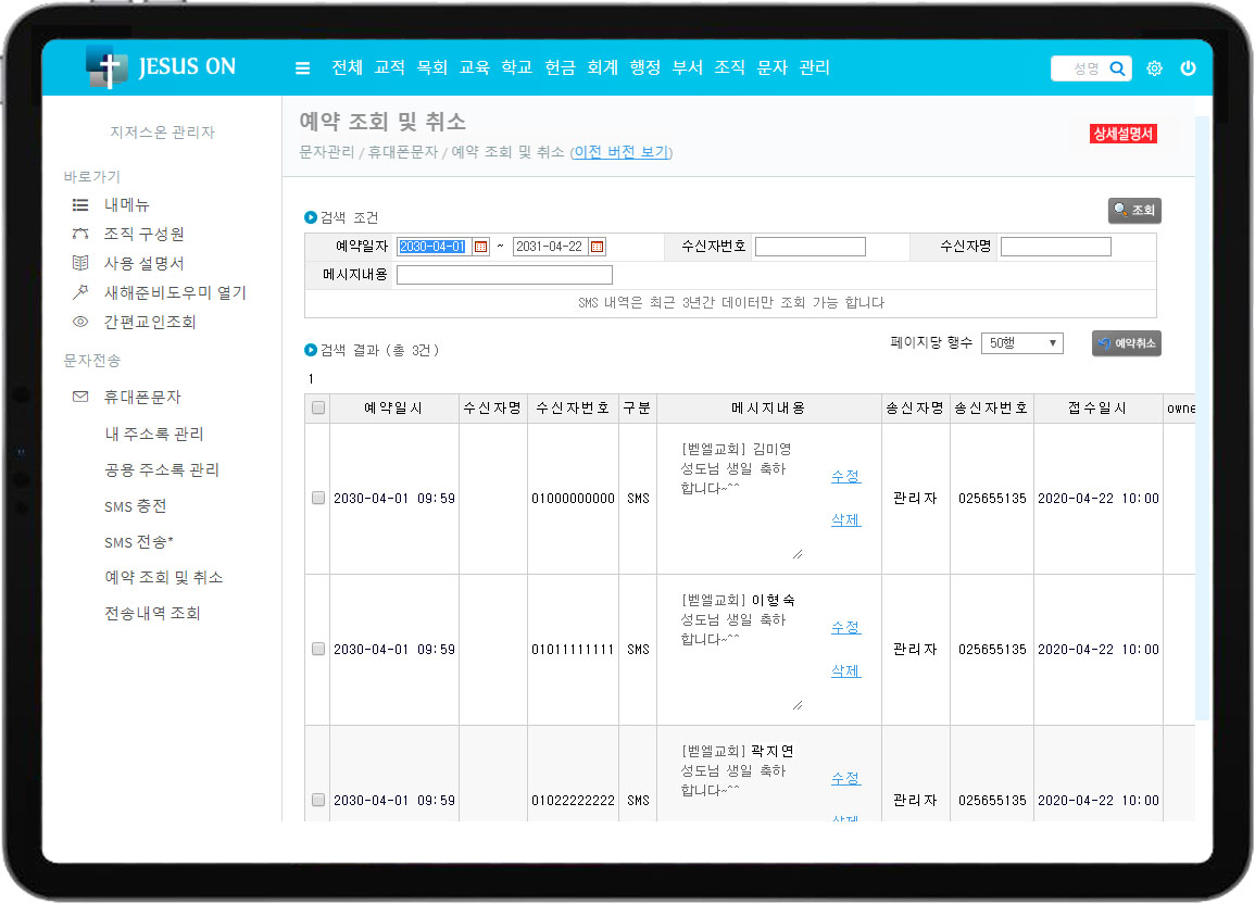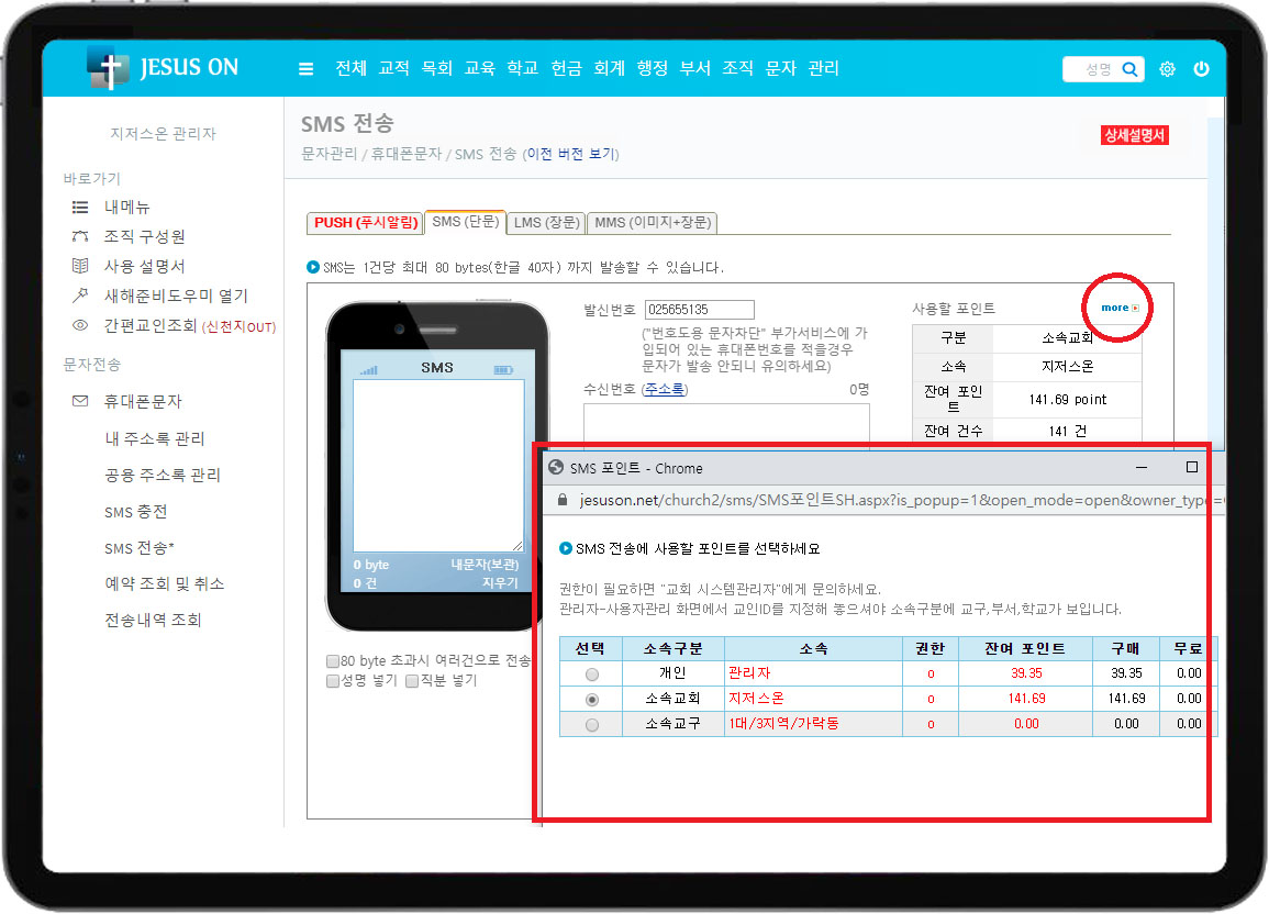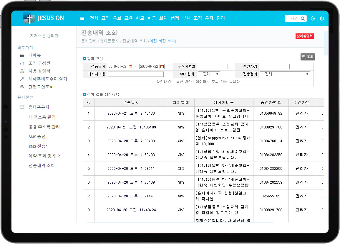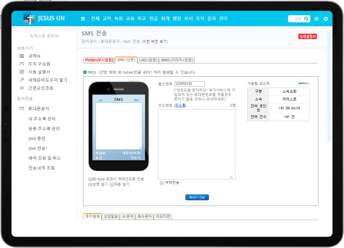 교회행정관리의 휴대폰문자 화면을 소개합니다.