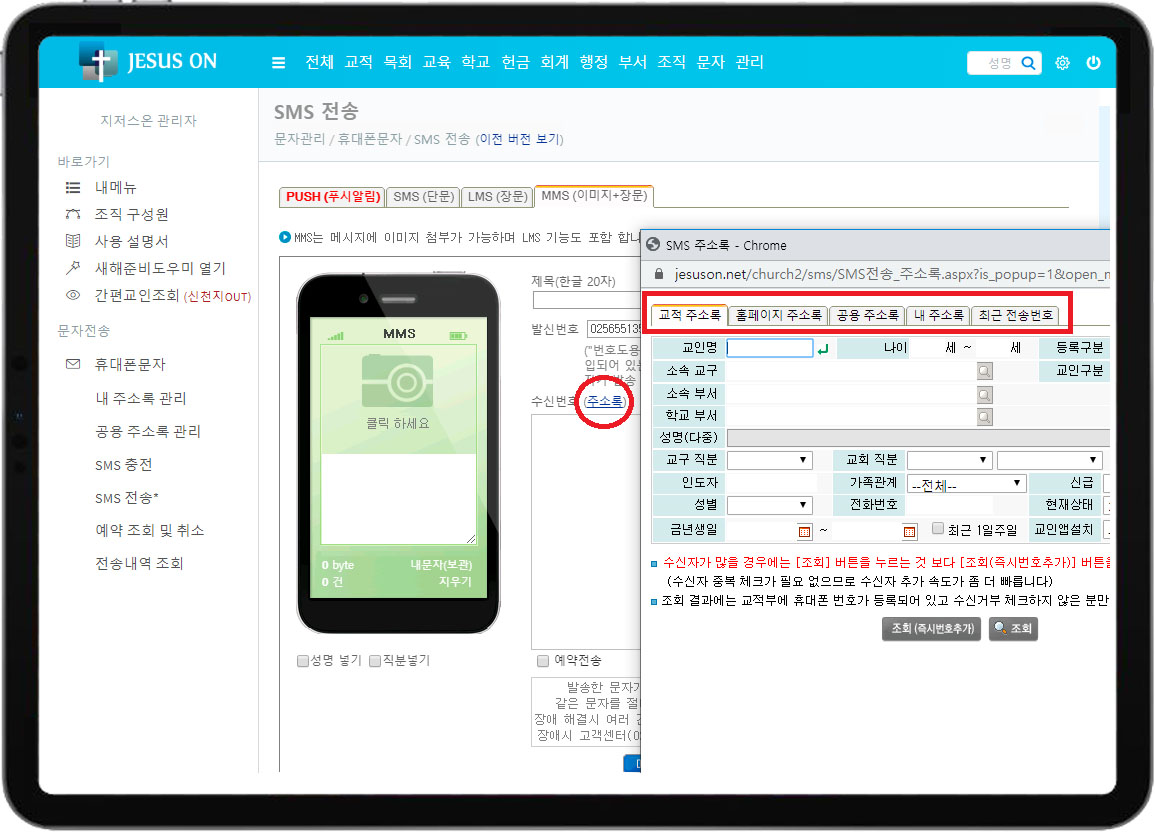 • 받는분 전화번호는 교적부나 개인/공용 주소록에서 불러와서 발송하면 편리 합니다.
